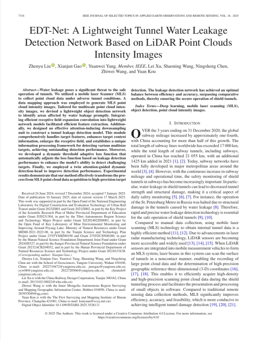 beats365官方网站研究生刘振宇以第一作者身份在SCI期刊《IEEE Journal of Selected Topics in Applied Earth Observations and Remote Sensing》上发表题为“EDT-Net: A Lightweight Tunnel Water Leakage Detection Network Based on LiDAR Point Clouds Intensity Images”的研究论文,beats365官方网站为论文第一署名单位,研究生刘振宇为第一作者,副教授高贤君为论文通讯作者。