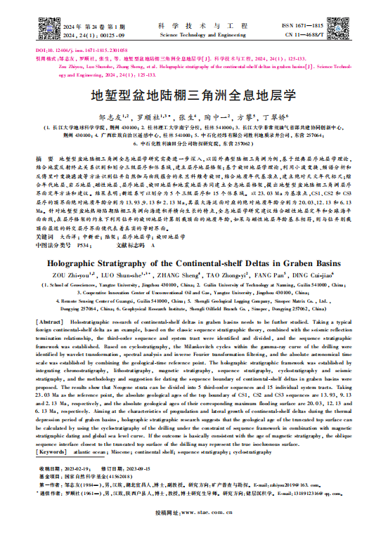 beats365官方网站邹志友博士联合研究团队,在《科学技术与工程》期刊上发表了题为“地堑型盆地陆棚三角洲全息地层学”的研究文章。该研究聚焦于地堑型盆地陆棚三角洲的全息地层学特征,主要研究内容及成果如下: