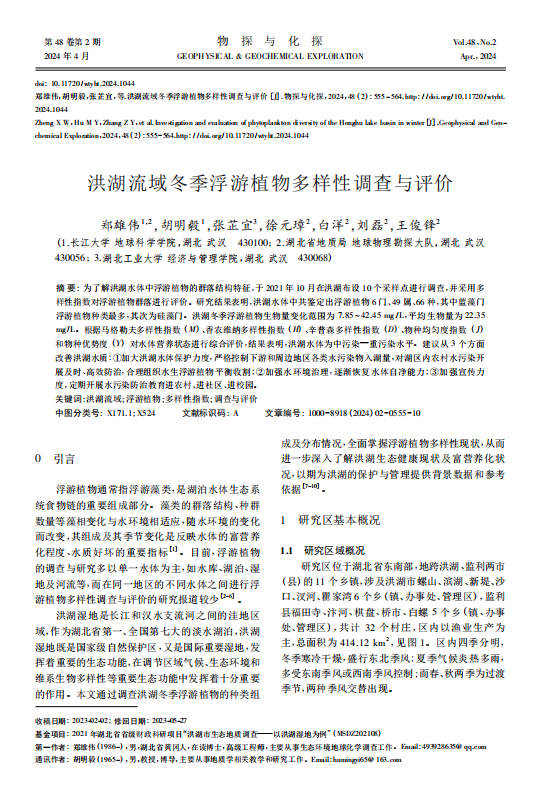 beats365官方网站博士生郑雄伟在《物探与化探》上发表题为“洪湖流域冬季浮游植物多样性调查与评价”的研究论文。该论文通过调查洪湖冬季浮游植物的种类组成及分布情况,全面掌握了浮游植物多样性现状,深入研究了洪湖生态健康现状及富营养化状况,为洪湖的保护与管理提供了背景数据和参考依据。