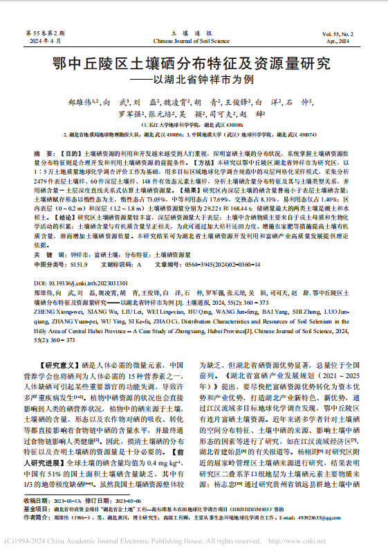 beats365官方网站博士生郑雄伟在《土壤通报》上发表题为“鄂中丘陵区土壤硒分布特征及资源量研究−以湖北省钟祥市为例”的研究论文。该论文选取鄂中丘陵区湖北省钟祥市西北部地区为研究对象,采用多目标区域地球化学调查规范中所采用的双层网格化模式采样,测定包括硒在内的土壤各类元素等30项指标,通过单位土壤硒含量揭示土壤硒的分布特征、硒的来源及影响因素,对湖北省土壤硒资源开发利用和富硒产业高质量发展有着重要的实际意义。