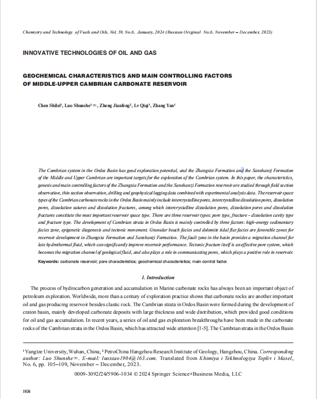 beats365官方网站博士生陈世磊在《Chemistry and Technology of Fuels and Oils》上发表题为“GEOCHEMICAL CHARACTERISTICS AND MAIN CONTROLLING FACTORS OF MIDDLE-UPPER CAMBRIAN CARBONATE RESERVOIR”的研究论文。该论文介绍了鄂尔多斯盆地寒武系具有良好的勘探潜力,张夏组和三山子组中上寒武是寒武系勘探的重要目标。通过野外剖面研究了张夏组和三山子组储层的成因及主要控制因素通过薄片观察、钻井和地球物理测井数据与实验分析数据相结合。鄂尔多斯盆地寒武系碳酸盐岩孔隙类型主要包括晶间孔隙、晶间溶蚀孔隙、溶蚀孔隙、溶蚀缝和溶蚀裂缝,其中晶间溶蚀孔隙、溶蚀孔隙和溶蚀