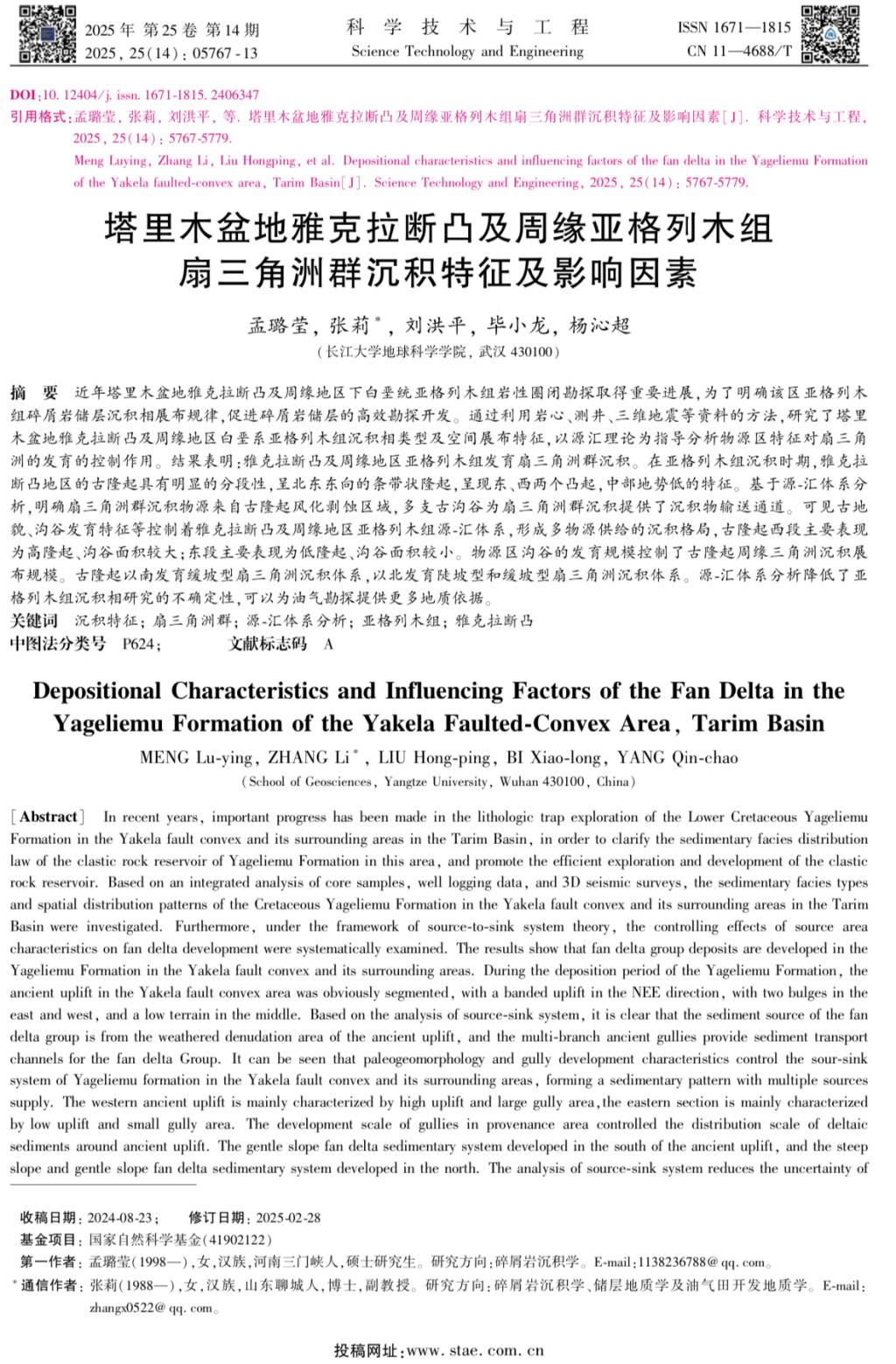 beats365官方网站22级硕士研究生孟璐莹在期刊《科学技术与工程》上发表题为“塔里木盆地雅克拉断凸及周缘亚格列木组扇三角洲群沉积特征及影响因素”的研究论文。beats365官方网站为论文第一署名单位,硕士研究生孟璐莹为论文第一作者,其导师张莉副教授为该文通讯作者。