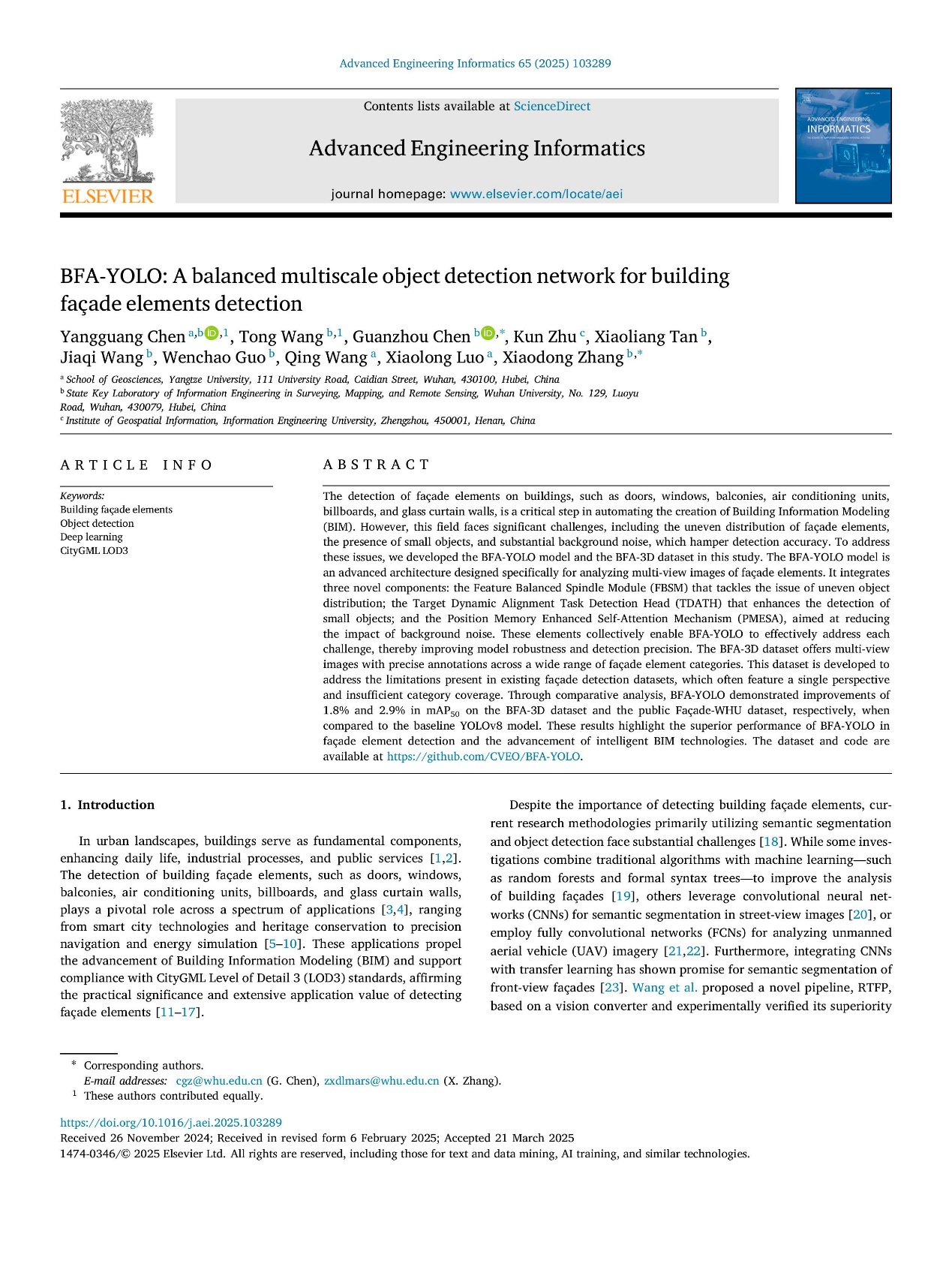 beats365官方网站硕士生陈阳光在人工智能领域顶刊《Advanced Engineering Informatics》发表题目为“BFA-YOLO: A balanced multiscale object detection network for building façade elements detection”的研究论文(Sci一区Top,CCF-B,影响因子8.0)。beats365官方网站为论文第一署名单位,硕士研究生陈阳光为论文第一作者,其导师罗小龙副教授为共同作者,公司兼职硕士生导师张晓东教授为通讯作者。