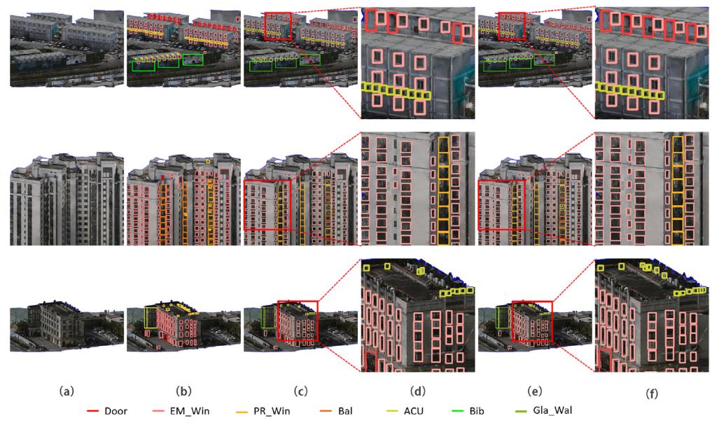 图3:BFA-3D测试集上BFA-YOLO和YOLOv8检测结果的视觉比较。(a)表示要检测的图像。(b)图示了标签可视化。(c)(e)示出了BFA-YOLO检测结果。(d)(f)是检测结果的局部放大。图片下方为类别标签。