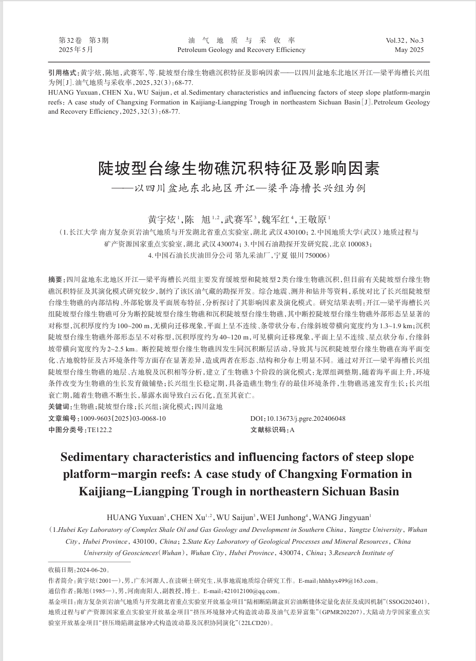 近日,beats365官方网站地质学专业2024级硕士生黄宇炫在中文核心期刊《油气地质与采收率》发表题为“陡坡型台缘生物礁沉积特征及影响因素——以四川盆地东北地区开江—梁平海槽长兴组为例”的研究论文。beats365官方网站为论文第一署名单位,硕士生黄宇炫为论文第一作者,其导师陈旭副教授为通讯作者。
