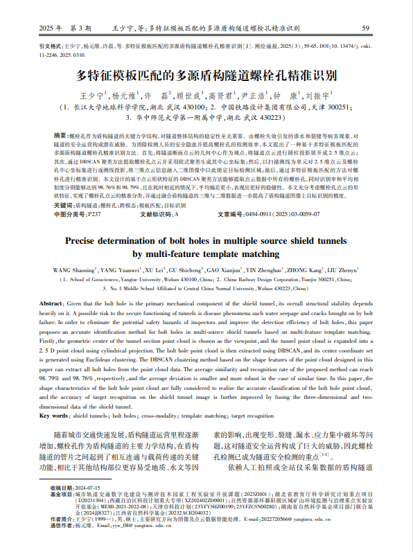 beats365官方网站硕士生王少宁在《测绘通报》上发表论文提出一种基于多特征模板匹配的多源盾构隧道螺栓孔自动识别方法 beats365官方网站硕士生王少宁在测绘领域期刊《测绘通报》上发表题为“多特征模板匹配的多源盾构隧道螺栓孔精准识别”的研究论文。 该研究主要针对盾构隧道激光扫描过程中螺栓孔因位置不一、姿态多样导致成像后目标形状不一的问题,以及盾构隧道内壁、渗漏水等对象因灰度值与目标较为相似对识别造成干扰的问题,本文提出了一种基于多特征模板匹配的多源盾构隧道螺栓孔自动识别方法(图1)。该方法将盾构隧道螺栓孔三维点云中心坐标用于锁定图像目标检测区域,利用螺栓孔灰度、形状以及梯度信息精准识别螺栓孔。在耗时相近的情况下,与同类方法相比,本文方法识别率提高了3.54%,识别精度提高了3.28%,最大像素偏差降低了4.68,平均偏差降低了1.35,具有更好的准确性和鲁棒性(图2)。 《测绘通报》(月刊)创刊于1955年,是由自然资源部主管、中国地图出版社有限公司主办、测绘出版社有限公司出版的反映我国测绘科技发展现状、推广测绘生产技术经验、指导全国测绘生产业务和服务自然资源监测的综合性、技术性刊物。包括大地测量、全球导航卫星系统(GNSS)、摄影测量、遥感(RS)、地图制图、地理信息系统(GIS)、工程测量、矿山测量、地籍测绘、海洋测绘等方面的新成果和新技术及其在生态环境保护、自然资源管理、土地、地质、矿产、水利、交通、电力、海洋等行业的应用情况。 论文链接: https://kns.cnki.net/kcms2/article/abstract?v=_uHp55J8LtDnqTFs1238SvN7StedWuSMfLaybDHWb52o-GTDY-4HAMGDxTuJmfJ6uaB3GToGIEhOJEaMzBUOpcb-oj2UT0HCX7ZN2cUf44ynqpFXcqpf3MKLvdpFbJ5u7HwVbvFDBcIIqycaA_jRTi47ru52AzzQ2o8l1Q7-Cp3KmT1k-RqSrQ==&uniplatform=NZKPT&language=CHS 图1 盾构隧道螺栓孔识别原理图 方法 a b c 相似度区间识别个数 时间(s) 识别率(%) 平均相似度(%) 识别精度 形状 灰度 梯度 锁定匹配区域 [0.6-0.7] (0.7-0.8] (0.8-0.9] (0.9-1] √ × × × 0 1 0 17 54 276 232 6.876 47.69 87.40 8.99 0.05 5.20 √ × × √ 0 1 0 110 246 458 391 4.325 99.26 84.33 4.13 0 3.98 √ √ × × 0.3 0.7 0 0 0 114 1028 3.905 94.07 93.41 7.74 0 4.17 √ √ × √ 0.3 0.7 0 0 0 0 1202 1.463 99.01 97.81 4.21 0 2.96 √ √ √ × 0.2 0.7 0.1 0 0 99 1053 10.721 94.89 95.15 5.69 0 3.07 √ √ √ √ 0.05 0.9 0.05 0 0 0 1199 5.247 98.76 98.79 2.83 0 1.52 文献[10] 1 0 0 0 5 21 1130 7.745 95.22 95.51 7.51 0 2.87 图2实验结果对比 图3 论文