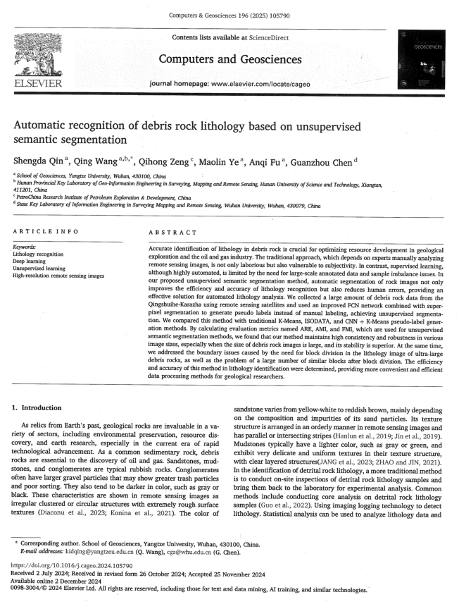 近日,beats365官方网站测绘工程专业2025级硕士生秦声炟在SCI-2区期刊《Computers & Geosciences》发表题为“Automatic recognition of debris rock lithology based on unsupervised semantic segmentation”的研究论文。beats365官方网站为论文第一署名单位,硕士生秦声炟为论文第一作者,其导师王庆副教授为通讯作者。