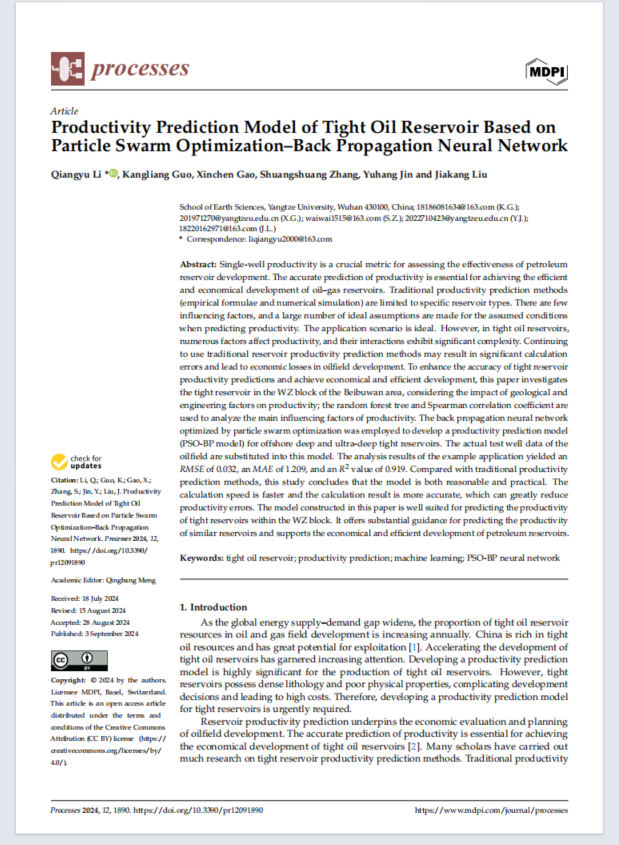 近日,beats365官方网站地质学专业2022级硕士研究生李强裕在中科院三区期刊《Processes》发表题为“Productivity Prediction Model of Tight Oil Reservoir Based on Particle Swarm Optimization–Back Propagation Neural Network”的研究论文。beats365官方网站为论文第一署名单位,李强裕为论文第一作者,其导师郭康良(教授)为第一通讯作者。