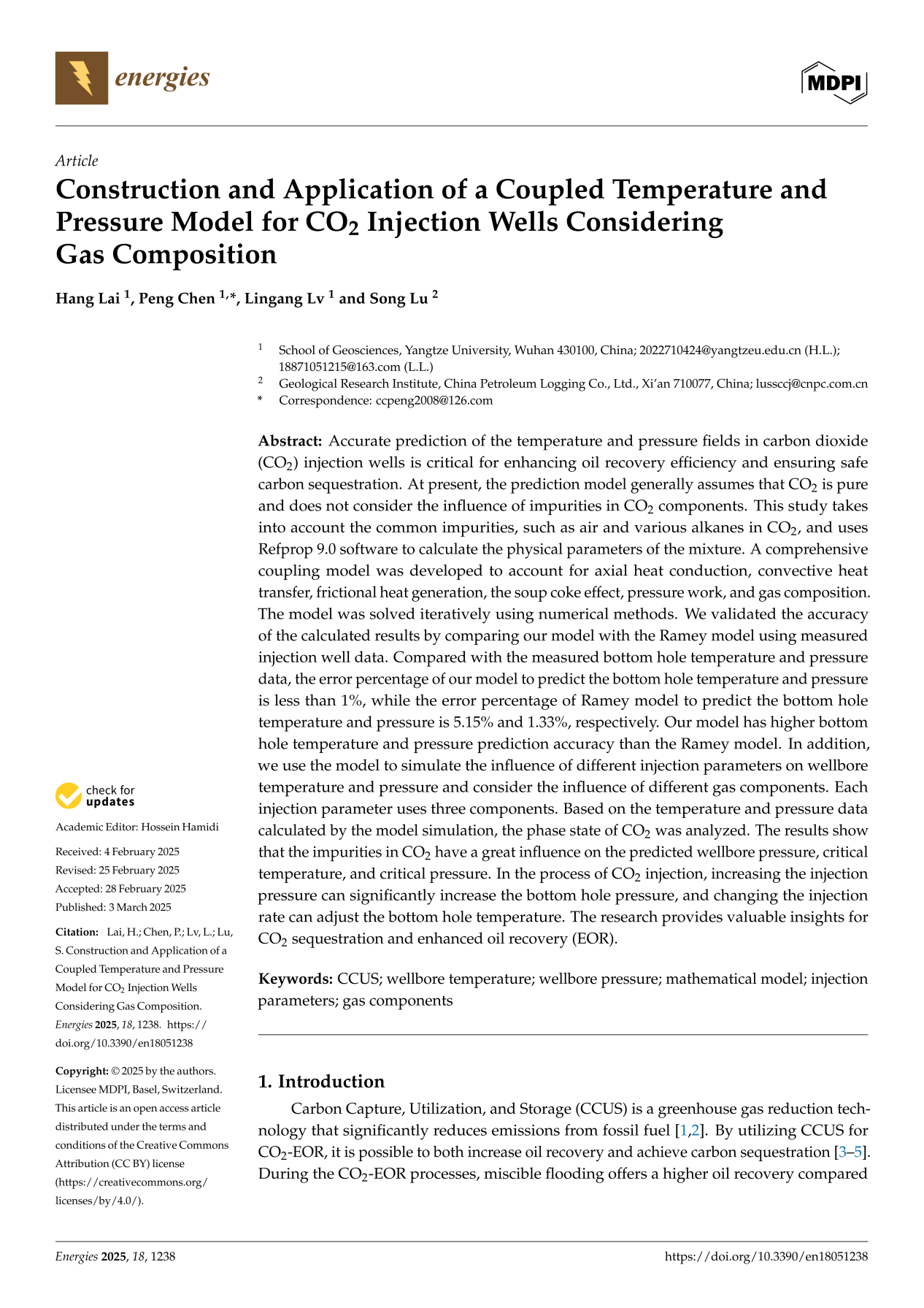 beats365官方网站硕士生来航在SCI收录期刊《Energies》发表题为“Construction and Application of a Coupled Temperature and Pressure Model for CO2Injection Wells Considering Gas Composition”的研究论文。beats365官方网站为论文第一署名单位,硕士生来航为论文第一作者,教师陈鹏为通讯作者。