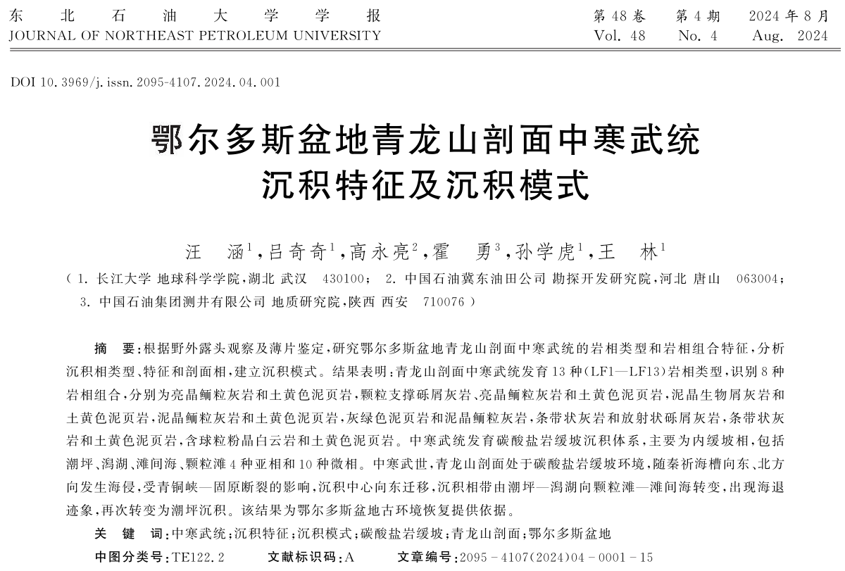 2024年8月15日,beats365官方网站22级硕士研究生汪涵在《东北石油大学学报》上发表题为“鄂尔多斯盆地青龙山剖面中寒武统沉积特征及沉积模式”的研究论文,beats365官方网站为论文第一署名单位,硕士研究生汪涵为论文第一作者,其导师吕奇奇副教授为该文通讯作者。