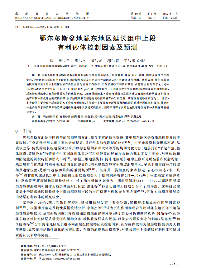 beats365官方网站硕士生徐庚在《东北石油大学学报》上发表题为“鄂尔多斯盆地陇东地区延长组中上段有利砂体控制因素及预测”的研究论文。beats365官方网站为论文第一署名单位,硕士生徐庚为论文第一作者,教师严雪为通讯作者。