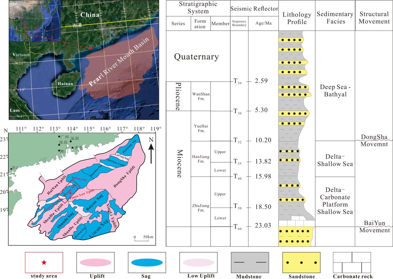 本研究以南海珠江口盆地恩平凹陷珠江组上段为研究对象,深入探讨天文轨道周期对古气候、海平面波动以及沉积发育的驱动机制。通过旋回地层学方法,结合自然伽马测井数据、地球化学参数(如化学蚀变指数CIA、氧化铝Al₂O₃含量等)以及沉积噪声模型(DYNOT和ρ1),对研究区进行了高分辨率时间序列分析。研究结果表明:(1)成功识别出405 kyr长偏心率、100 kyr短偏心率、40 kyr斜率及20 kyr岁差周期,并基于这些周期构建了15.98–19.09 Ma的高精度天文年代标尺;(2)海平面变化与405 kyr长偏心率周期显著同步,长偏心率高值期对应温暖湿润气候与海平面上升,沉积物以细粒泥岩为主;而低值期则为干热气候与海退,沉积物以粗粒砂岩为主;(3)地球化学参数验证了气候-海平面-物源的协同作用,揭示了天文轨道周期通过调控岁差振幅影响气候变化,进而控制沉积物类型与分布。本研究为天文轨道周期驱动下沉积储层预测提供了理论支撑,对南海深层油气勘探具有重要的理论和实践意义。