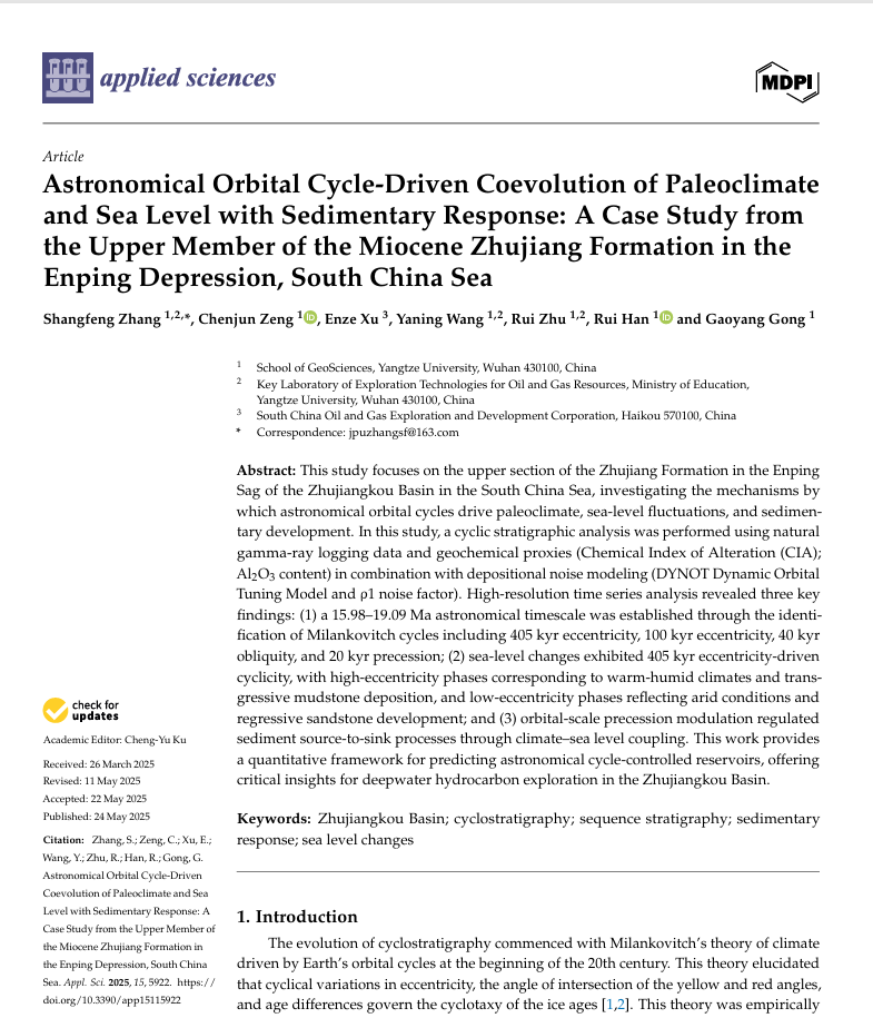 beats365官方网站张尚锋教授在《Applied sciences》上发表题为“Astronomical Orbital Cycle-Driven Coevolution of Paleoclimate and Sea Level with Sedimentary Response: A Case Study from the Upper Member of the Miocene Zhujiang Formation in the Enping Depression, South China Sea”的研究论文。beats365官方网站为论文第一署名单位,张尚锋教授为论文第一作者,硕士生曾晨峻为该文第二作者。该项研究得到国家自然科学基金“南海北部宽缓大陆架海平面变化及双坡折带层序地层模型”的资助。