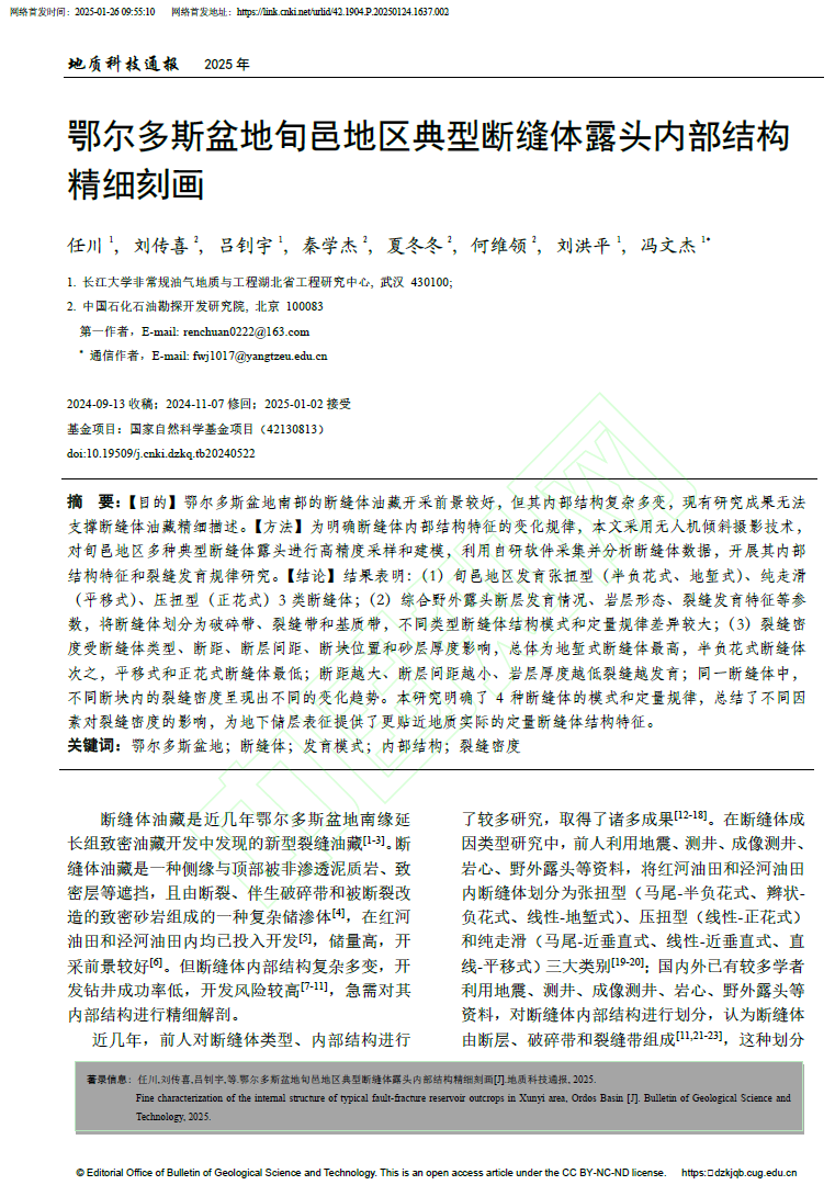 beats365官方网站研究生任川在期刊《地质科技通报》上发表题为“鄂尔多斯盆地旬邑地区典型断缝体露头内部结构精细刻画”的研究论文。beats365非常规油气地质与工程湖北省工程研究中心为论文第一署名单位,冯文杰副教授为通讯作者。