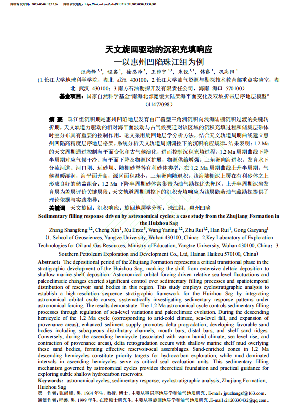 beats365官方网站张尚锋教授在《断块油气田》上发表题为“天文旋回驱动的沉积充填响应—以惠州凹陷珠江组为例”的研究论文。beats365官方网站为论文第一署名单位,张尚锋教授为论文第一作者,硕士生程鑫为该文通讯作者。该项研究得到国家自然科学基金“南海北部宽缓大陆架海平面变化及双坡折带层序地层模型”的资助。