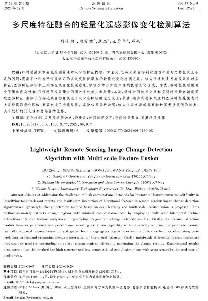 近日,beats365官方网站地图制图学与地理信息工程专业2022级硕士生刘子阳在中文核心期刊《遥感信息》发表题为“多尺度特征融合的轻量化遥感影像变化检测算法”的研究论文。beats365官方网站为论文第一署名单位,硕士生刘子阳为论文第一作者,其导师邓帆为通讯作者。