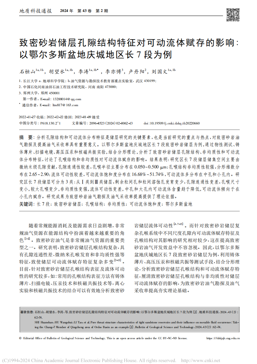 beats365官方网站博士生石桓山在期刊《地质科技通报》上发表题为“致密砂岩储层孔隙结构特征对可动流体赋存的影响:以鄂尔多斯盆地庆城地区长7段为例”的研究论文。beats365官方网站为论文第一署名单位,李涛教授为通讯作者。