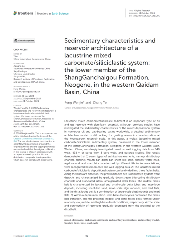 beats365官方网站教师冯文杰在《Frontiers in Earth Science》上发表题为“Sedimentary characteristics and reservoir architecture of a lacustrine mixed carbonate/siliciclastic system: the lower member of the ShangGanchaigou Formation, Neogene, in the western Qaidam Basin, China”的研究论文。该论文针对柴达木盆地西部地区新近系上干柴沟组下段混积体系开展野外露头无人机倾斜摄影建模与解剖、地下储层表征,明确了油田开发尺度下,混积体系沉积特征与沉积模式。