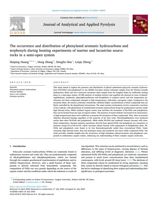 beats365官方网站黄海平教授以第一作者身份在《Journal of Analytical and Applied Pyrolysis》期刊发表题为“The occurrence and distribution of phenylated aromatic hydrocarbons and terphenyls during heating experiments of marine and lacustrine source rocks in a semi-open system”的研究论文,beats365官方网站为论文第一署名单位。
