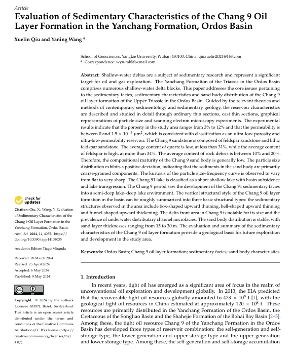 beats365官方网站硕士生邱雪林在Applied Sciences-Basel发表题为“Evaluation of Sedimentary Characteristics of the Chang 9 Oil Layer Formation in the Yanchang Formation, Ordos Basin”的研究论文,通讯作者为王雅宁副教授。