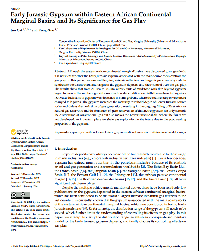 beats365官方网站蔡俊副教授在《JMSE》上发表题为“Early Jurassic Gypsum within Eastern African Continental Marginal Basins and Its Significance for Gas Play”的研究论文。该研究通过基于钻测井和地震资料,结合地球化学数据,分析了转换型陆缘盆地膏盐岩分布特征、成因及其对油气分布的控制作用。研究结果显示在陆间裂谷期的海平面上升阶段,由于水体较深出现盐度分层作用导致薄层膏盐岩析出;随着海平面下降,在地堑控制的洼地形成潟湖环境,蒸发作用的加剧导致了厚层膏盐岩的形成。膏盐岩的发育提升了前转换期烃源岩成熟的阈值,导致大规模生排烃的迟滞,这或许是转换陆缘盆地巨型油气藏形成的重要原因之一。