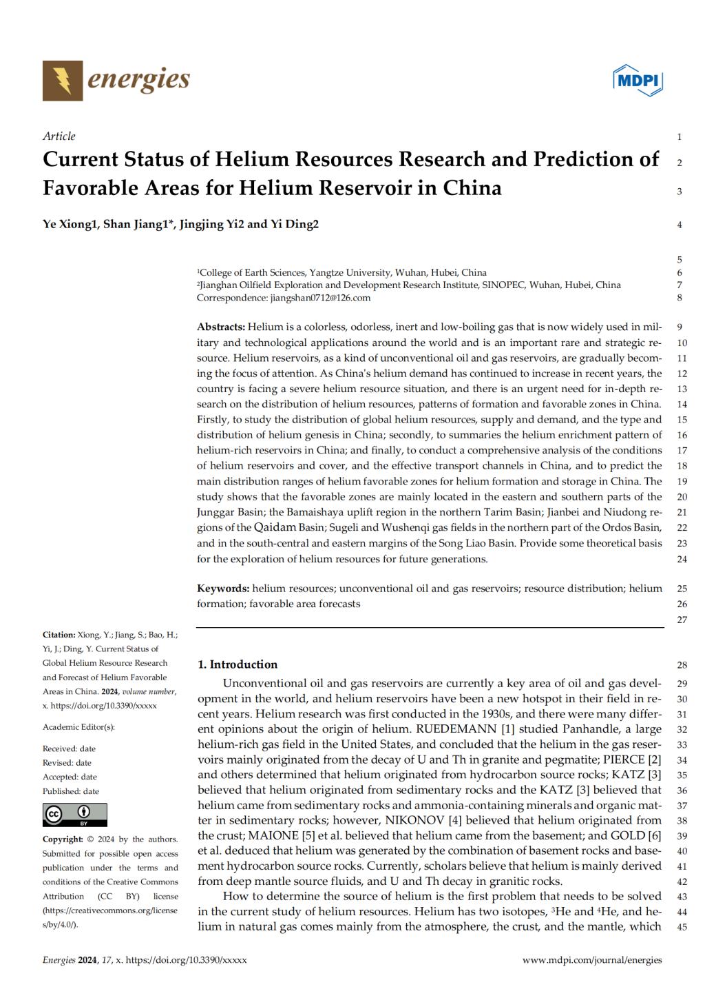 beats365官方网站硕士生熊烨在《Energies》发表题为“Current Status of Helium Resources Research and Prediction ofFavorable Areas for Helium Reservoir in China”的研究论文。beats365官方网站为论文第一署名单位,硕士生熊烨为论文第一作者,教师江山为通讯作者。