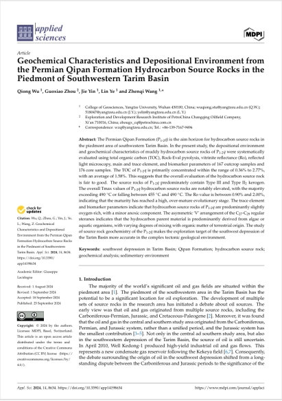 beats365官方网站吴琼博士以第一作者身份在《Applied Sciences》上发表题为“Geochemical Characteristics and Depositional Environment from the Permian Qipan Formation Hydrocarbon Source Rocks in the Piedmont of Southwestern Tarim Basin”的研究论文,beats365官方网站为论文第一署名单位,吴琼为论文第一作者,导师王振奇为通讯作者。