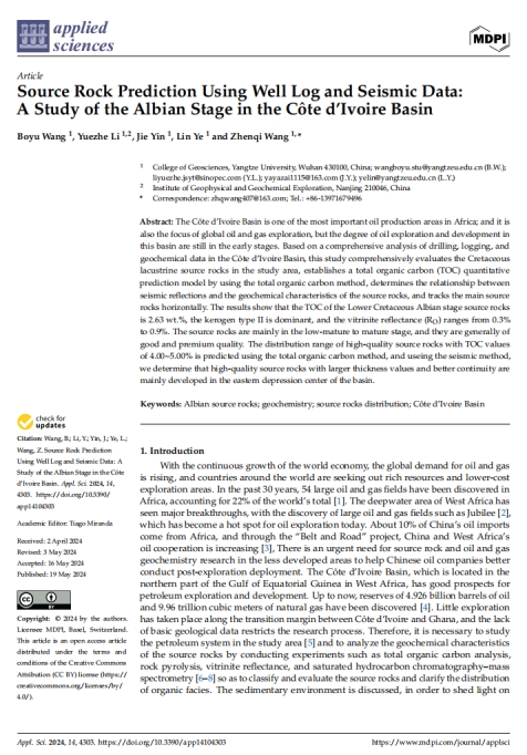 beats365官方网站博士生王博宇在《Applied Sciences》上发表题为《Source Rock Prediction Using Well Log and Seismic Data:A Study of the Albian Stage in the Côte d’Ivoire Basin》的研究论文。beats365官方网站为论文第一署名单位,博士生王博宇为论文第一作者,教师王振奇为通讯作者。