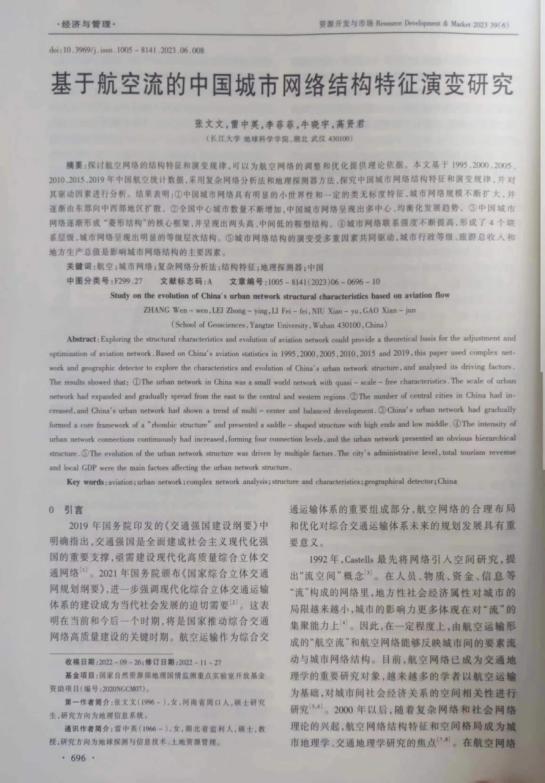 beats365官方网站张文文在《资源开发与市场》发表题为“基于航空流的中国城市网络结构特征演变研究”的研究论文。beats365官方网站为论文第一署名单位,教师雷中英为论文通讯作者。