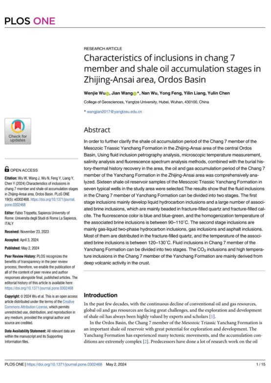 beats365官方网站硕士生吴文杰在《PLOSONE》发表题为“Characteristics of inclusions in chang 7 member and shale oil accumulation stages in Zhijing-Ansai area, Ordos Basin”的研究论文。beats365官方网站为论文第一署名单位,硕士生吴文杰为论文第一作者,教师王健为通讯作者。