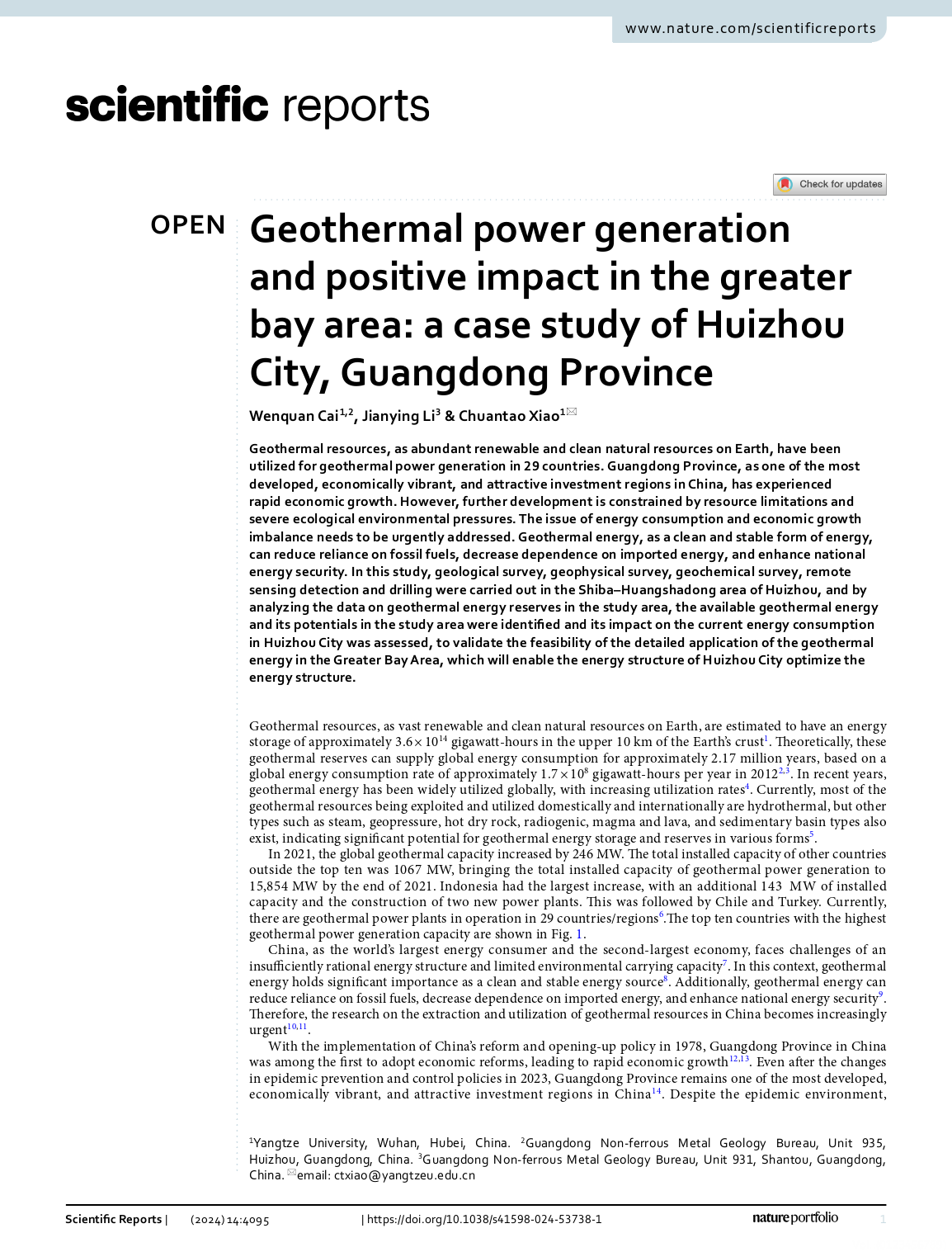 beats365官方网站地质学专业硕士生蔡文权在国际综合类科技期刊《Scientific Reports》上发表题为“Geothermal power generation and positive impact in the greater bay area: a case study of Huizhou City, Guangdong Province”的研究论文。beats365官方网站为论文第一署名单位,硕士研究生蔡文权为论文第一作者,其导师肖传桃教授为该文通讯作者。