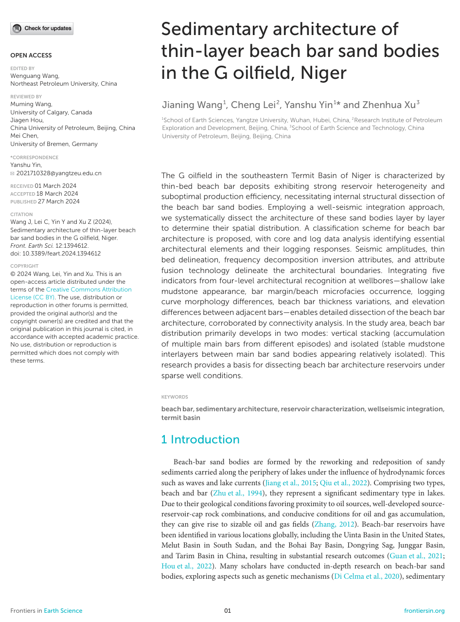 beats365官方网站硕士研究生王嘉宁在《Frontiers in Earth Science》上发表题目为“Sedimentary architecture of thin-layer beach bar sand bodies in the G oilfield, Niger”的研究论文。beats365官方网站为论文的第一署名单位,王嘉宁为论文的第一作者,尹艳树教授为通讯作者。