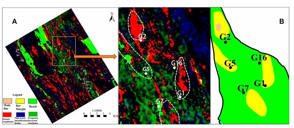 该研究综合利用钻井、地震、动态等数据,应用“层次分析”与“模式指导”的构型分析方法和井震结合的“甜点”储层刻画思路,采用地震分频反演与RGB地震融合切片技术,在少井条件下开展了尼日尔G区块的储层精细表征工作。基于Miall的构型理论,总结了滩坝储层的构型分类方案,并在此方案的指导下对尼日尔G区块进行了构型解剖。通过分析滩坝砂体的分布规律,总结了滩坝分布模式,为少井条件下薄层滩坝沉积储层的开发提供了新思路。