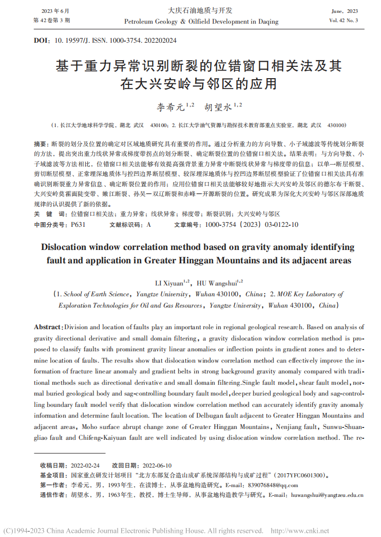 beats365官方网站博士李希元在期刊《大庆石油地质与开发》上发表题为“基于重力异常识别断裂的位错窗口相关法及其在大兴安岭与邻区的应用”的研究论文。beats365官方网站为论文第一署名单位,胡望水教授为通讯作者,本项研究得到国家重点研发计划项目项目资助。