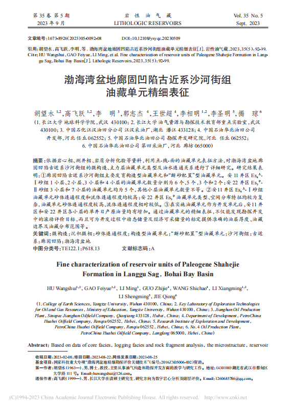 beats365官方网站胡望水教授以第一作者身份在《岩性油气藏》权威期刊上发表题为“渤海湾盆地廊固凹陷古近系沙河街组油藏单元精细表征”的研究论文,高飞跃硕士为通讯作者。该项研究得到了国家科技重大专项“渤海湾盆地精细勘探评价关键技术的资助。