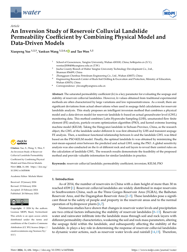 beats365官方网站王艳昆副教授以通讯作者身份在SCI期刊《Water》上发表题为“An Inversion Study of Reservoir Colluvial Landslide Permeability Coefficient by Combining Physical Model and Data-Driven Models”的研究论文,该项研究得到了国家自然科学基金、湖北省自然科学基金和西藏自治区科技厅项目的共同资助。