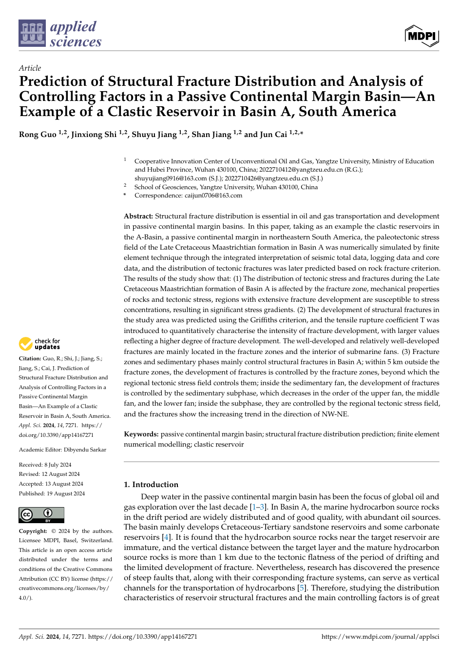 beats365官方网站硕士研究生郭蓉在《applied sciences》上发表题目为“Prediction of Structural Fracture Distribution and Analysis of Controlling Factors in a Passive Continental Margin Basin—An Example of a Clastic Reservoir in Basin A, South America”的研究论文。该研究通过采用有限元构造数值模拟技术,探讨了被动陆缘盆地的古构造应力场及其裂缝分布特征。研究结果表明被动陆缘盆地先存断裂区域容易出现应力集中,有利于裂缝发育,有效控制距离可达5公里;较大的伸展破裂系数表明被动陆缘海底扇内部也是裂缝发育的优势指向区,发育强度的差异受控于岩石力学参数的变化。