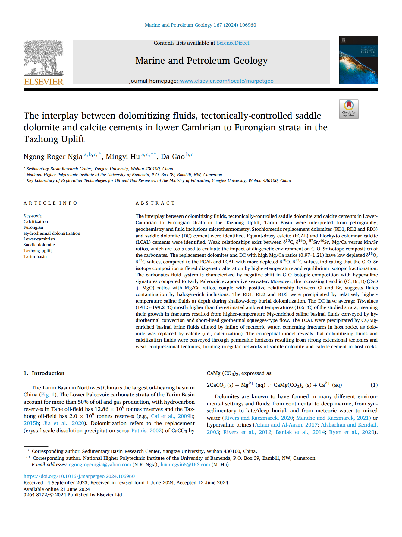 beats365官方网站胡明毅教授团队在石油地质领域主流期刊《Marine and Petroleum Geology》发表了题为“The interplay between dolomitizing fluids, tectonically-controlled saddle dolomite and calcite cements in lower Cambrian to Furongian strata in the Tazhong Uplift”的研究论文。