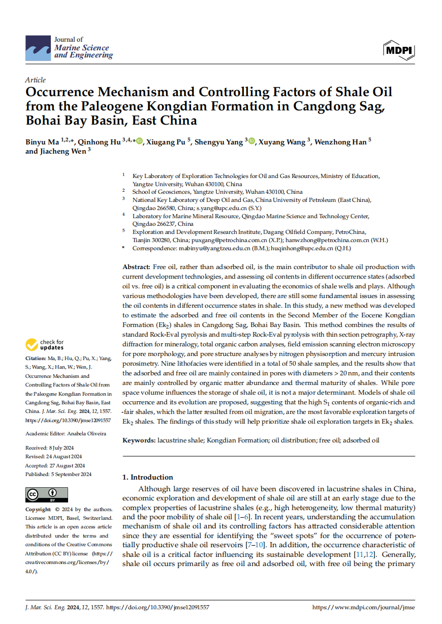 beats365官方网站地质系马斌玉博士以第一作者身份在海洋地质学领域主流期刊《Journal of Marine Science and Engineering》(JMSE)上发表题为“Occurrence Mechanism and Controlling Factors of Shale Oilfrom the Paleogene Kongdian Formation in Cangdong Sag,Bohai Bay Basin, East China”的研究论文,该项研究得到了国家自然科学基金、中国博士后基金和油气资源与勘探技术教育部重点实验室开放基金的资助。