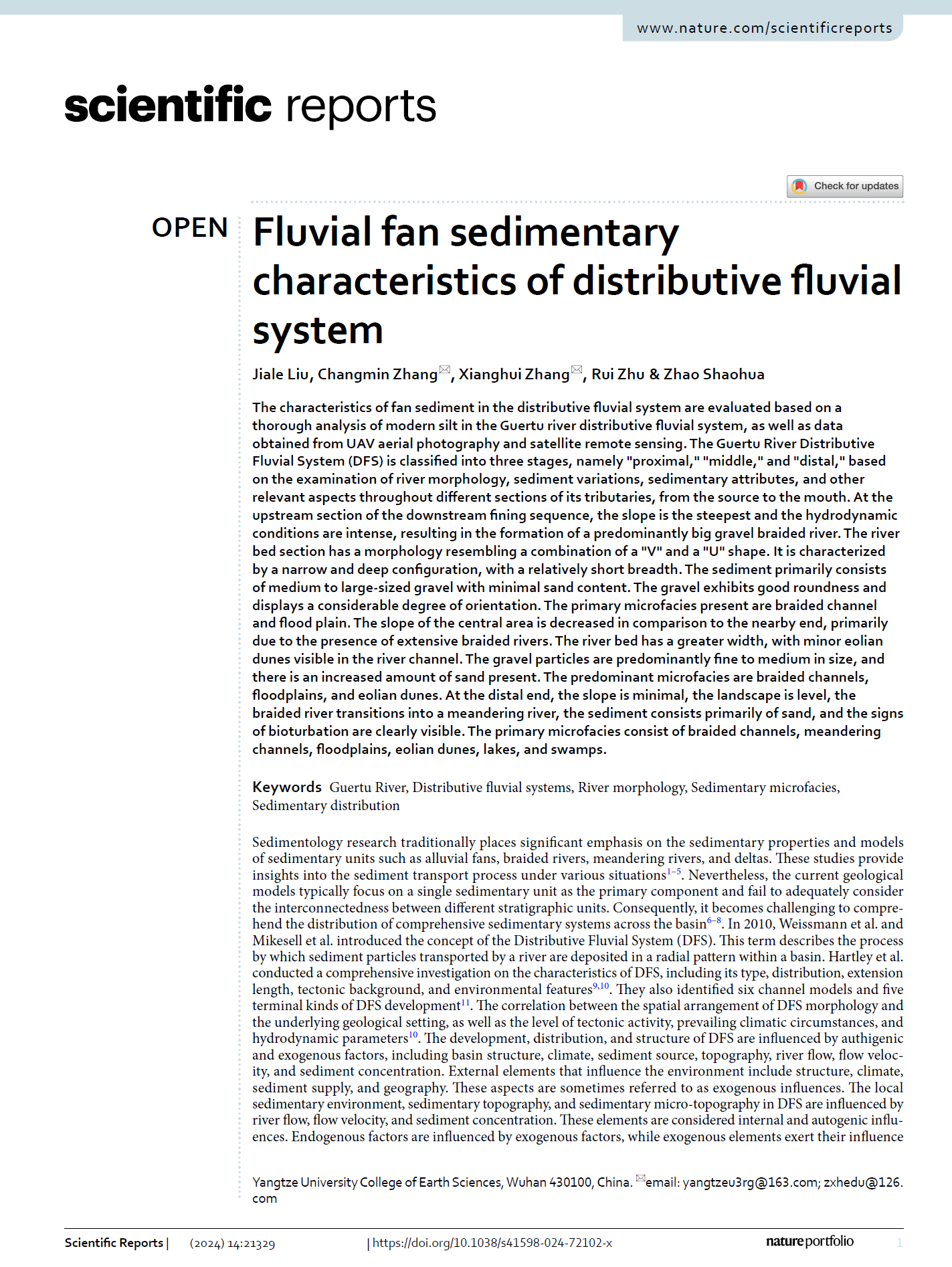 beats365官方网站博士生刘家乐在期刊《scientific reports》上发表题为“Fluvial fan sedimentary characteristics of distributive fluvial system”的研究论文。beats365官方网站为论文第一署名单位,张昌民教授、张祥辉博士为共同通讯作者,本项研究得到国家自然科学基金重点项目、湖北省自然科学基金项目共同资助。