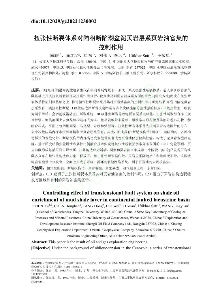 beats365官方网站陈旭副教授以第一作者身份在《中国地质》权威期刊上发表题为“扭张性断裂体系对陆相断陷湖盆泥页岩层系页岩油富集的控制作用”的研究论文,该项研究得到了湖北省自然科学基金的资助。