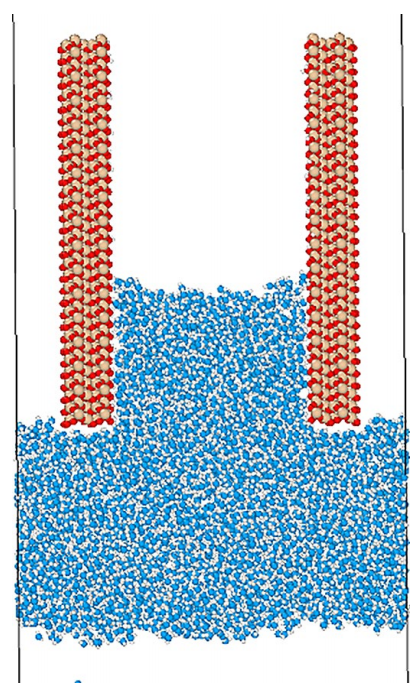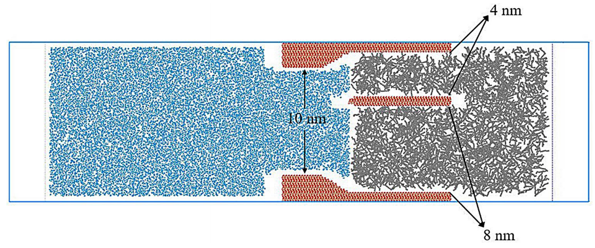 该研究通过分子动力学模拟,建立了石英纳米孔隙水的渗吸和水驱油模型,研究不同因素对渗吸效果的影响及其在水驱过程中的作用。结果表明,水在纳米孔中的渗吸速率与温度、孔径和润湿性有关。渗透强度随润湿性的增加而增加。温度上升加速了系统中水分子的运动,从而提高了渗吸速度,增强了渗吸强度,缩短了达到平衡所需的时间,但渗吸总量保持不变。孔径越小,吸附强度越强。在低注入速率下,渗吸起主导作用,随着注入速率的逐渐增加,驱替起主导作用。