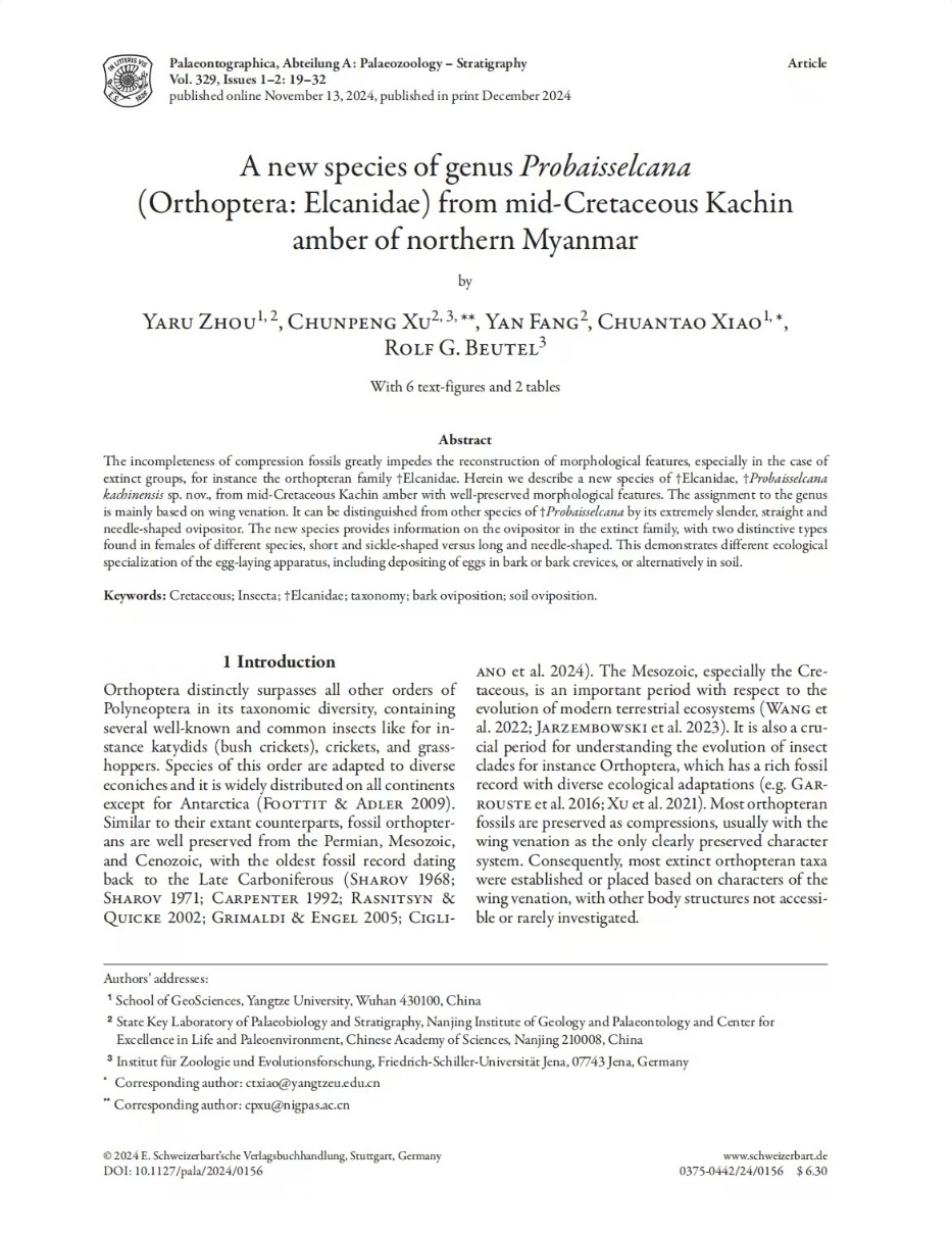 beats365官方网站地质学专业硕士研究生周雅茹在肖传桃教授、南京地质古生物研究所的许春鹏博士的共同指导下,在地球科学与古生物学领域期刊《PalaeontographicaAbteilungA》上发表题为“Anew species of genusProbaisselcana (Orthoptera:Elcanidae) from mid-Cretaceous Kachin amber of northern Myanmar”的研究论文。