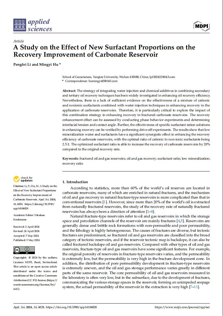 beats365官方网站2021级硕士生李鹏飞在期刊《Applied Sciences》上发表了题为“A Study on the Effect of New Surfactant Proportions on the Recovery Improvement of Carbonate Reservoir”的研究论文。beats365官方网站为论文第一署名单位,李鹏飞为第一作者,其导师胡明毅教授为该文通讯作者。