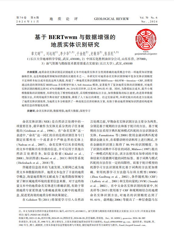 beats365官方网站刘远刚团队硕士研究生章文琦在《地质论评》发表了题为《基于BERTwwm与数据增强的地质实体识别研究》的研究论文,beats365官方网站为论文第一署名单位,章文琦为论文第一作者,其导师刘远刚为该文通讯作者。
