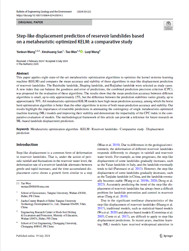 beats365官方网站教师王艳昆副教授以第一作者身份在2区SCI期刊《Bulletin of Engineering Geology and the Environment》发表题为《Step-like displacement prediction of reservoir landslides based on a metaheuristic-optimized KELM: a comparative study》的研究论文。beats365官方网站为论文的第一署名单位,地质(工程)22001班本科生孙新爽为该文第二作者,温韬副教授为该文通讯作者,本项研究得到国家自然科学基金项目、湖北省自然科学基金项目、西藏自治区科技计划项目、青海省科技计划项目和老员工创新创业训练计划项目共同资助。