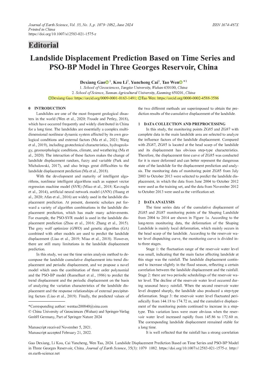beats365官方网站温韬副教授团队长期从事极端条件下滑坡灾害演化机理、预测及防治方面的研究,指导本科生高德祥在综合性地学学术2区期刊《Journal of Earth Science》上发表题为“Landslide Displacement Prediction Based on Time Series and PSO-BP Model in Three Georges Reservoir, China”的研究论文。beats365官方网站为论文第一署名单位,本科生高德祥为论文第一作者,温韬副教授为该文通讯作者,本项研究得到国家自然科学基金项目、非常规油气协同创新中心、湖北省爆破工程重点实验室开放基金项目共同资助。