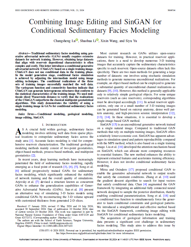 beats365官方网站李少华教授团队长期从事储层地质建模,人工智能建模等方向的研究。团队成员卢昌盛博士在遥感技术和地球科学领域期刊《IEEE Geoscience and Remote Sensing Letters》上发表了题为《Combining Image Editing and SinGAN for Conditional Sedimentary Facies Modeling》的研究论文,beats365官方网站为论文第一署名单位,博士生卢昌盛为论文第一作者,其导师李少华教授为该文通讯作者。