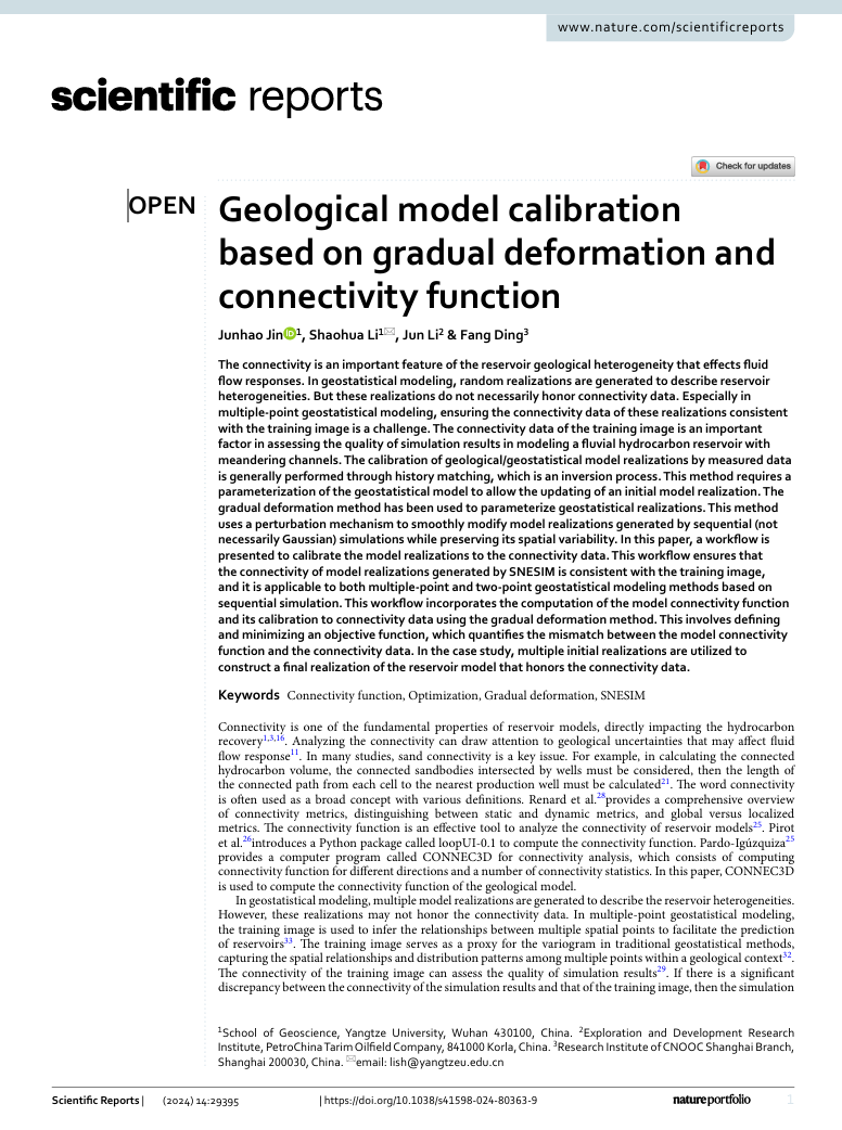 beats365官方网站李少华教授团队长期从事地质统计学建模的研究,团队成员金俊浩在《Scientific Reports》期刊上发表题为“Geological model calibration based on gradual deformation and connectivity function”的研究论文。beats365官方网站为论文第一署名单位,硕士研究生金俊浩为论文第一作者,其导师李少华教授为该文通讯作者。