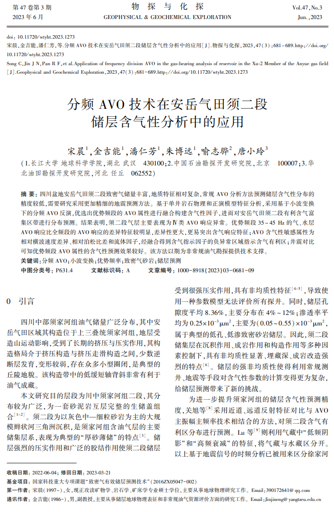 beats365官方网站硕士生宋晨在地球物理领域期刊《物探与化探》期刊发表题为“分频AVO技术在安岳气田须二段储层含气性分析中的应用”的研究论文。beats365官方网站为论文第一署名单位,硕士生宋晨为论文第一作者,金吉能副教授为通讯作者。